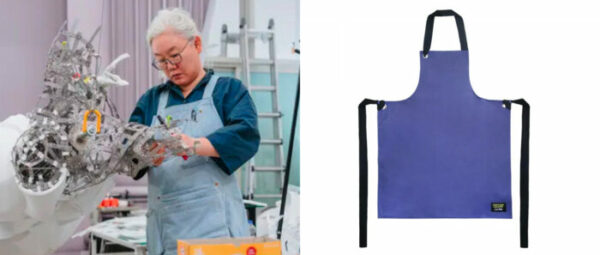 South-Korean artist Lee Bul is celebrated for her futuristic sculptures and installations, often evoking cyborgs, armour and mirrored architectures. When the Hayward Gallery staged her landmark exhibition in 2018, Field Grey was invited to create a bespoke apron for the exhibition shop — a retail piece that reflected her sculptural sensibility while remaining wearable and functional.