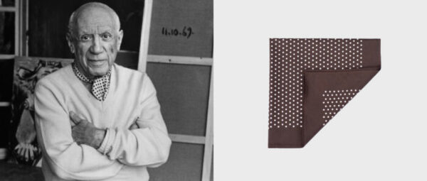 Few artists understood the power of an image like Pablo Picasso. His striped Breton shirt – once a French naval uniform – became his visual emblem, immortalised in countless photographs. But it wasn’t the only accessory that defined him. In several portraits, Picasso appears with a polka-dot scarf knotted at his neck, adding a note of flamboyance to his otherwise simple, utilitarian look.