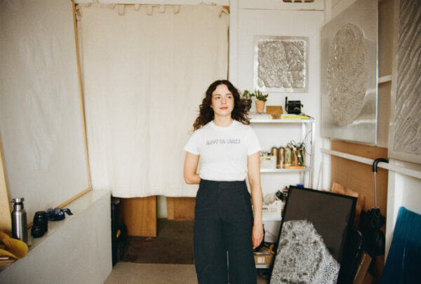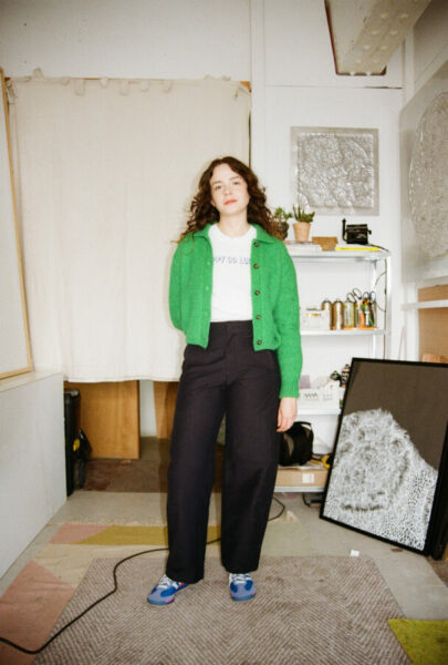 That hands-on, physical approach shapes what she wears. Studio days call for layers she can peel off, soft fabrics that don’t dig in, and clothes that can handle being leaned on, stretched in and generally lived in. Outside the studio, her wardrobe stays unfussy — a mix of Uniqlo staples, second-hand finds and a few pieces she knows will fit, work hard and still feel like her.